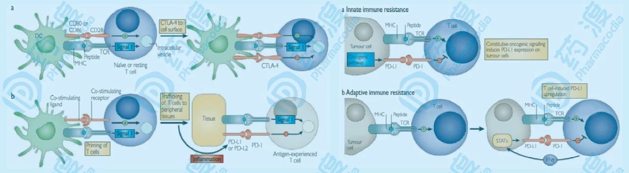 圖1 :免疫負調控示意圖 (a)當T細胞對抗原產生初次響應時,CTLA-4介導的免疫檢查點被誘導激活。這種由CTLA-4介導的誘導激活程度,依賴于起始T細胞受體調整的信號強度。高親和配體能夠誘導表達更多的CTLA-4,從而減弱了起始響應的強度。當T細胞受體遭遇抗原后,誘導下游通路,CTLA-4被轉運到細胞表面,此時CTLA-4起到信號減弱的功能,以維持一個恒定的T細胞激活水平。(b)與CTLA-4不同,PD-1信號通路并不在起始T細胞激活階段起作用,而是在外周組織中,效應T細胞識別組織中的抗原,以調節炎癥響應的過程中。這些組織中的炎癥信號(IFN-γ,主要由I型輔助T細胞表達)能夠誘導組織細胞中的PD-L1的表達,從而抑制效應T細胞對其免疫響應。在慢性抗原暴露的情況下,T細胞表面過量誘導的PD-1,可以引發T細胞的活性耗竭。(c)在腫瘤細胞中,PD-L1的表達或不依賴于腫瘤微環境中的炎癥信號,AKT、STAT3信號通路的激活可誘導表達PD-L1,或依賴于炎癥信號,表達下游的免疫檢查點抑制蛋白。