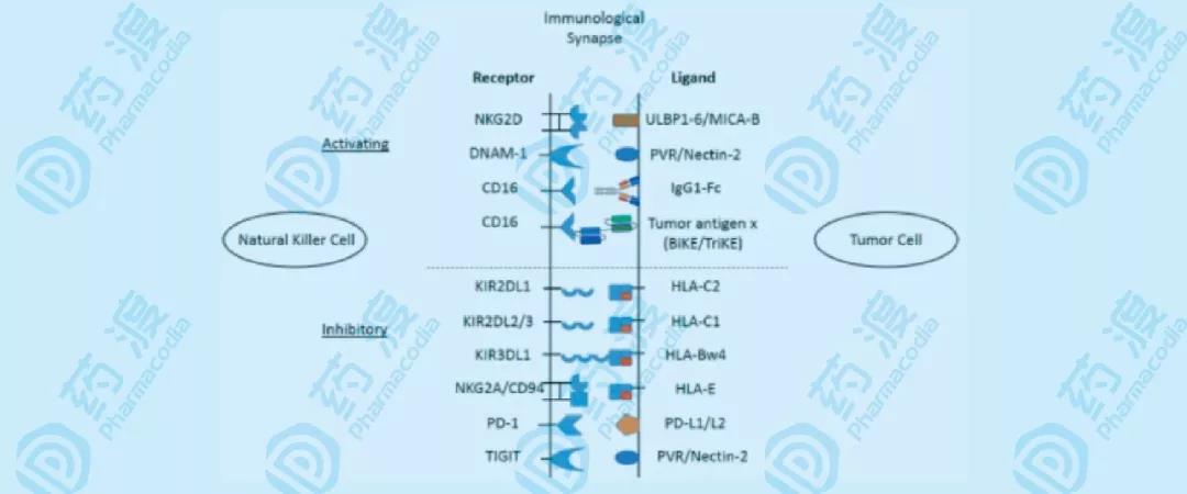 盡管NK細胞并不需要腫瘤相關抗原識別,來調整抗腫瘤的響應,但NK細胞同樣存在免疫檢查點的激活或抑制機制。雖然目前在細胞因子治療方法,以及NK細胞過繼轉移等方面有所進步,但是,腫瘤細胞表達的針對NK細胞免疫檢查點的配體,仍然能夠抑制NK細胞介導的腫瘤細胞裂解。于是NK細胞功能缺失,腫瘤逃逸,病情加劇。因此目前有一些新的藥物被研發出來,針對腫瘤-NK細胞的抑制型免疫檢查點,以限制這種抑制作用。