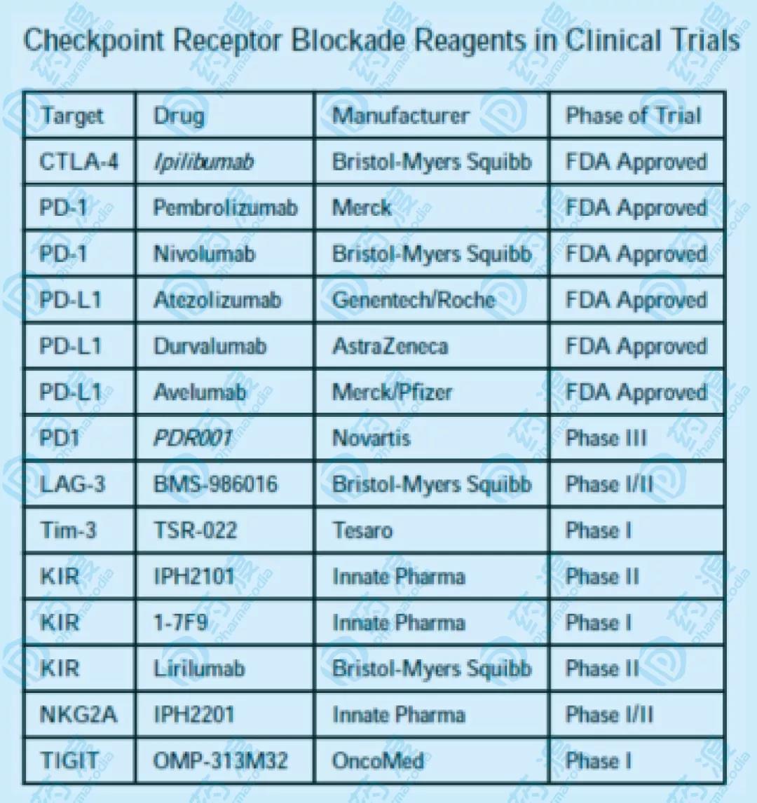 KIR抗體,IPH2101,在針對那些完全緩解狀態的急性髓細胞樣白血病患者的I期臨床研究中,顯示KIR結合發生在90%以上的NK細胞中(2周,最小劑量1mg/kg體重)。KIR抗體的治療也升高了TNF-α和MIP-1β的血清濃度,以及NK細胞早期的激活標簽CD69。在多發性骨髓瘤的治療中,KIR抗體也產生了類似的效果。然而,在關于郁積性多發性骨髓瘤(MM)的II期臨床中,并沒有顯著療效。這可能與IPH2101介導的KIR2D受體的胞啃作用有關,即通過KIR抗體的ADCC作用,KIR2D受體被“啃掉”并轉移到其他免疫細胞。盡管KIR抗體有效地阻斷了KIR2D的信號通路,但是也阻斷了這些表達KIR2D的NK細胞被“教育”(結合MHC-I)的能力,最終可能導致NK細胞對MM細胞的響應清零。這個難題也揭示了,在復雜的生物系統中,靶向檢查點抑制研發所存在的一些挑戰。