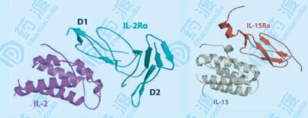 圖5 IL-2/IL-2Rα和IL-15/IL-15Rα的結構示意圖 IL-2和IL-15共享受體的兩個亞基,即IL-2Rβγ和IL-15Rβγ完全相同,雙亞基復合體以中親和力受體存在,而結合了IL-2Rα或IL-15Rα的三亞基復合體,則以高親和力受體存在。NK細胞表達中等親和力的IL-2和IL-15受體。通常情況下,IL-2通過順式作用,即先于同一細胞的IL-2Rα結合,然后與βγ結合,但NK細胞沒有表達IL-2Rα,需要較高濃度的IL-2才能激活。而IL-15通過反式作用,即先于另一細胞(巨噬細胞、DC細胞)的IL-15Rα結合,然后與βγ結合。