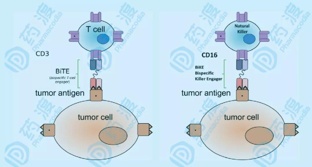圖6 BiTE和BiKE BiTE能夠同時結合T細胞和腫瘤細胞,具有兩條scFv串聯結構的抗體,分別結合T細胞的CD3ε(TCR亞基)和腫瘤細胞的腫瘤相關抗原。而BiKE則能夠同時結合NK細胞和腫瘤細胞,結構與BiTE相近,結合NK細胞的CD16a,強化ADCC作用,以及腫瘤相關抗原。新一代的BiTE甚至加入了抗PD-1/PD-L1的scFv,以減少免疫檢查點抑制。類似的原理(圖3),BiKE可以融合IL-15或拮抗前述受體信號通路的scFv(TriKE),移除免疫抑制或增強免疫響應。