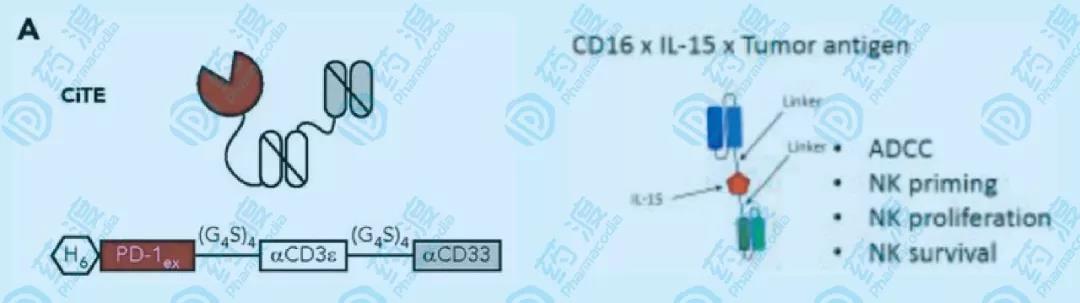 激活NK細胞、解除NK細胞的免疫抑制、限制NK細胞毒性的時空。 新的針對NK細胞的研究,比如仿照BiTE思路而來的BiKE(圖6),以及仿照CAR-T思路的CAR-NK(另文描述)。BiTE加上抗PD-1的部分成為了CiTE(檢查點抑制T細胞連接抗體),那么BiKE加上了IL-15的部分而成為了TriKE(三功能NK細胞連接抗體,圖7,8):
