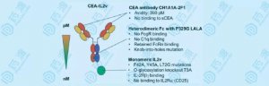 圖9 用于免疫治療的細胞因子,其中一些還處于臨床研究階段 細胞因子是多肽或蛋白質,在重組基因表達上,容易實現在哺乳動物細胞中的表達,只需將INFs、ILs之類的融合在抗體的N端或C端。比如羅氏在研的RG7813(圖10),包含抗CEA單抗,且其中一條重鏈的C端融合改造后的IL-2。同樣的,前文提到的TriKE,基于scFv抗體,以拉近NK細胞和腫瘤細胞,并通過融合細胞因子激活NK細胞的活性。