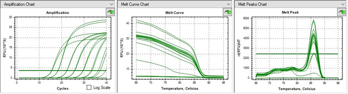 本產品利用熱啟動酶 HS Taq DNA polymerase 進行 qPCR 擴增反應,通過擴增產物嵌合SYBR Green I 而激發的熒光信號強度進行檢測。