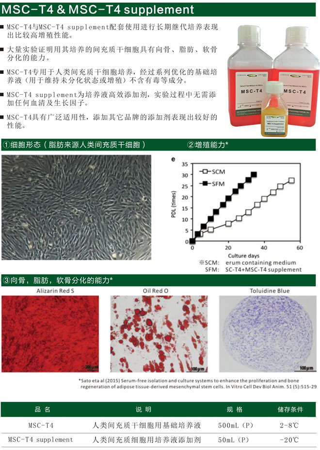 【產品名稱】間充質干細胞無血清培養基 【產品概述】MSC-T4 無血清培養基是專為間充質干細胞研究而開發的基礎培養基,不含有任何動物蛋白質成分,含有重組或醫療級人類蛋白質的無血清細胞培養基,滿足人類間充質干細胞體外長期傳代及增殖培養;增殖培養后的細胞具有分化為骨,軟骨和脂肪等組織的能力。 【產品用途】適用于人間充質干細胞體外增殖培養,僅供科研使用。 【產品規格】500ml/瓶 【使用方法】