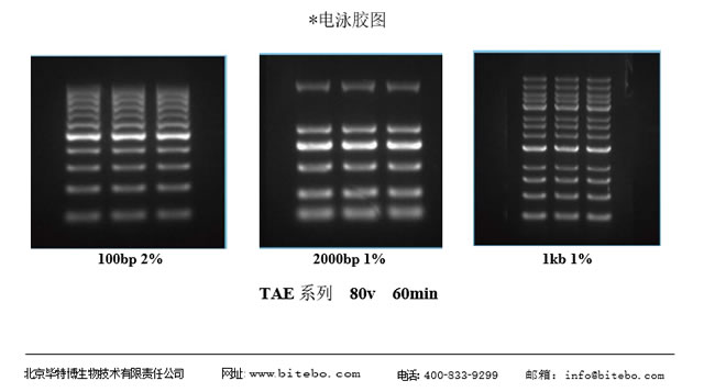 5. 兼容:瓊脂糖預(yù)染預(yù)制膠為 TAE 體系,與實(shí)驗(yàn)室常規(guī)自制的 TAE 瓊脂糖膠完全一致,使用完美銜接,您只需要用您之前的TAE 電壓電泳即可。